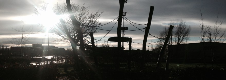 De hemel heeft gehuild boven de haven. Natte stenen, natte tenen. De slingerende schommel op een verlaten speelplein nodigt mij uit om even te verpozen en te genieten van de post-industriële depressie die tussen donkeren en klaren over het eiland waait.