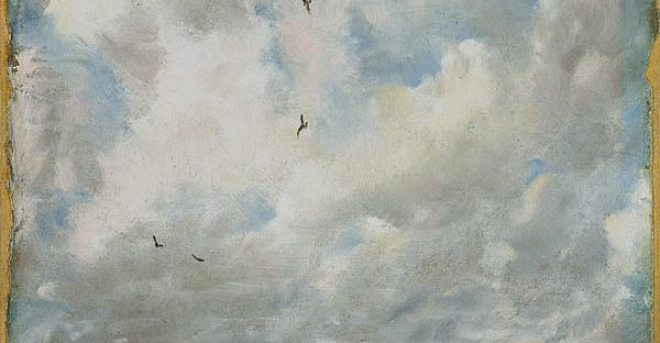 Ik struin wat doelloos langs de kaai, kijk omhoog en denk: dat zijn wolken met dagboekkwaliteiten. Het sombere grijs is van een intieme schoonheid, en doet me denken aan Gothic romans en Schotse kastelen. Het mag regenen wat het wil, er blijft toch altijd nog een beetje mysterie in de wolken plakken. Ik ga even op een bolder zitten, en neem een pen uit mijn zak. Op de een of andere manier voel ik me wat Constable vandaag. En dan ineens die zwaluwen erbij; alsof ze me zagen zitten. Ik schets wat ik zie: niet veel, maar net genoeg om een blaadje te vullen met enkele eenvoudige woorden die me vrolijk stemmen. En dat is uiteindelijk wat Constable ook deed: de natuur schilderen in al haar bescheiden schoonheid, zonder haar te romantiseren of iets te overdrijven, en daar in stilte van genieten. In 1821 -exact tweehonderd jaar geleden- zat hij dus op een kruk, ergens in het Engelse platteland, net zoals ik hier nu op die bolder zit. Ik voel een bijzondere verbinding die tijd en ruimte overstijgt, en een onbeschrijflijke dankbaarheid ten aanzien van de lieftallige eenzaamheid die mij tot zulke goede dingen in staat stelt. Want dromen is goed. En bovendien een hele prestatie, op zo’n grauwe dag als deze.En ja, het mag dan misschien een beetje klef zijn om iets over wolken te schrijven, want daar is immers al zoveel over gezegd, maar denk dan eens aan Joni Mitchell: er zijn twee kanten om naar de wolken te kijken… and somehow we still don’t know clouds at all… Ik pen de laatste zin op het blaadje neer, en lach tevreden voor me uit: geschilderd met woorden, ‘en plein air’. Wat verlangt deze schrijfster nog meer?